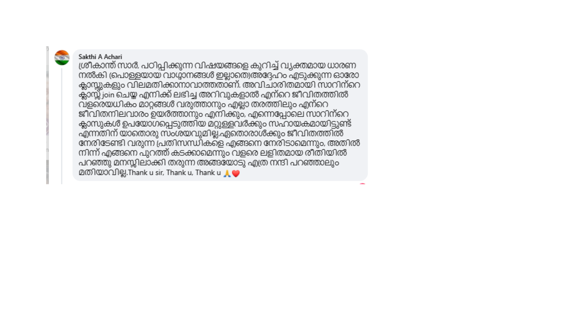 🌷 വിജയകരമായി പൂർത്തിയാക്കുന്നവർക്ക് ബോണസ് ആയി Rs 6,650/- മൂല്യമുള്ള 2 ഓൺലൈൻ ലൈവ് ഗൈഡഡ് സെഷനുകൾ ലഭിക്കും. ഈ ബോണസ് സെഷനുകളുടെ തീയതി, സമയം ഇവ പിന്നീട് അറിയിക്കുന്നതാണ്.